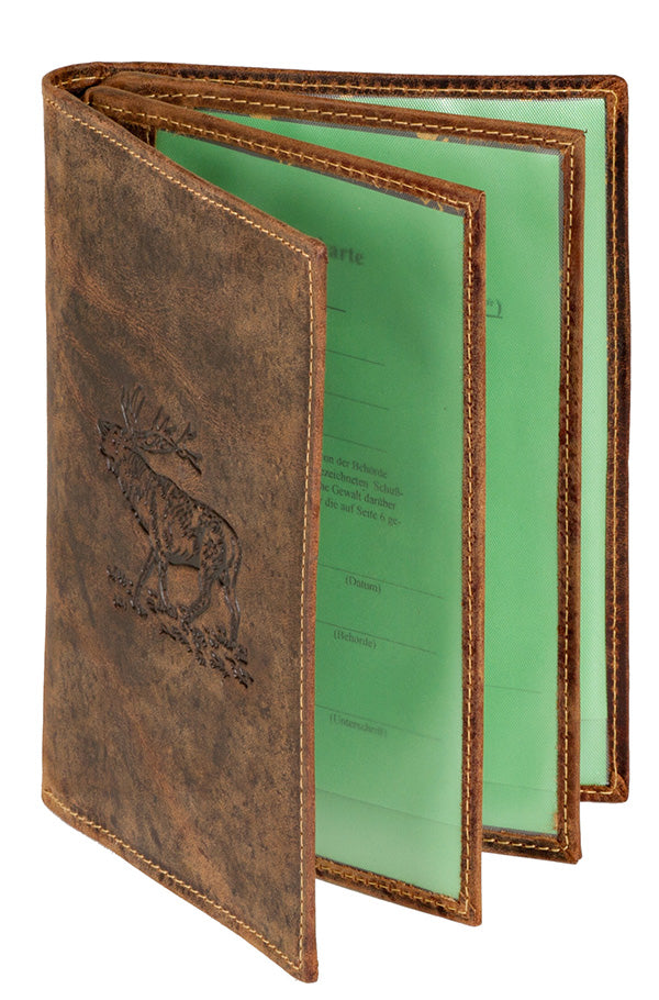 Das Jagdscheinetui besteht aus Echtleder und ist auf der Vorderseite mit einem Hirsch geprägt.